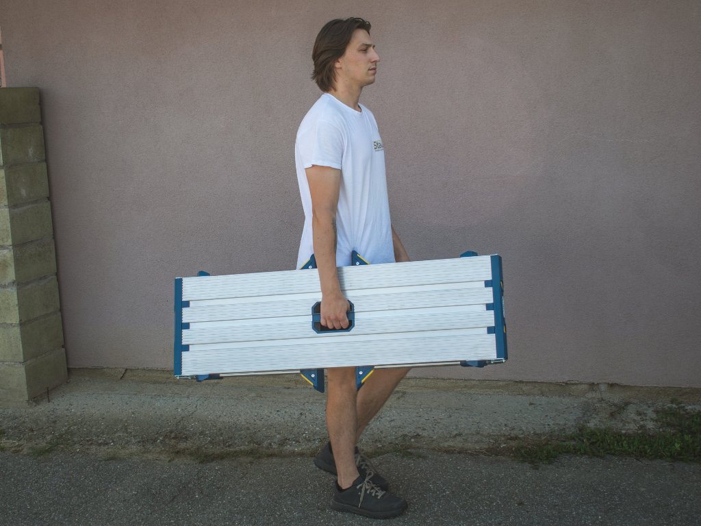 | Varianta | Materiál | Nastaviteľná výška | Možné napojenie | Veľkosť nášľapnej plochy (cm) | Plocha vo výške (m) | Pracovná výška (m) | Zložená: dĺžka × šírka × výška (cm) | Hmotnosť (kg) |