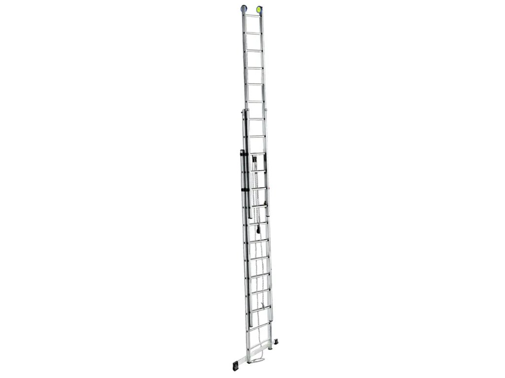 EURO E3F Trojdielny výsuvný rebrík s lanomTrojdielny hliníkový výsuvný rebrík EURO E3F z drážkovaného hliníka je určený pre profesionálne použitie v stavebníctve, údržbe a technických prevádzkach. Robustná konštrukcia z kvalitného hliníka zaisťuje vysokú pevnosť, dlhú životnosť a zároveň nízku hmotnosť pre jednoduchú manipuláciu. Rebrík spĺňa požiadavky európskej normy EN 131 a má nosnosť 150 kg, čo ho robí vhodným pre každodenné profesionálne nasadenie. Rebrík je rozdelený na tri diely. Prvým krokom je ručné vysunutie najmenšieho, tretieho dielu. Následne sa druhý a tretí diel vysunú súčasne pomocou lana a dvojitej kladky, čo výrazne uľahčuje manipuláciu a skracuje čas potrebný na nastavenie požadovanej výšky. Súčasťou výbavy sú aj kolieska pre jednoduchý posun po stene. V prípade nechceného uvoľnenia lana sa kladka automaticky zachytí o najbližšiu priečku, čím zabráni samovoľnému zosunutiu horného dielu rebríka. Protišmykové priečky o rozmere 27 × 27 mm s rozostupom 28 cm zaisťujú pohodlný a stabilný nášľap. Rebrík je ďalej vybavený stabilizátorom s nylonovou výstuhou, zariadením na blokáciu vysunutia, ktoré zabraňuje pohybu rebríka po dosiahnutí bezpečnostného limitu, a protišmykovými gumovými pätkami. Tieto prvky spoločne zaručujú vysokú úroveň bezpečnosti a komfortu pri práci vo výškach. |