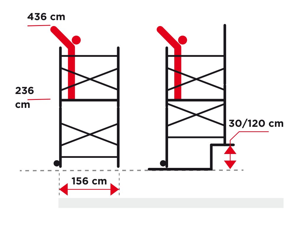 | Varianta | Celková výška (cm) | Šírka – stabilizátor (cm) | Šírka – vrchná časť (cm) | Dĺžka – spodná časť (cm) | Veľkosť plošiny (cm) | Maximálna výška plošiny (cm) | Maximálna pracovná výška (cm) | Hmotnosť (kg) |