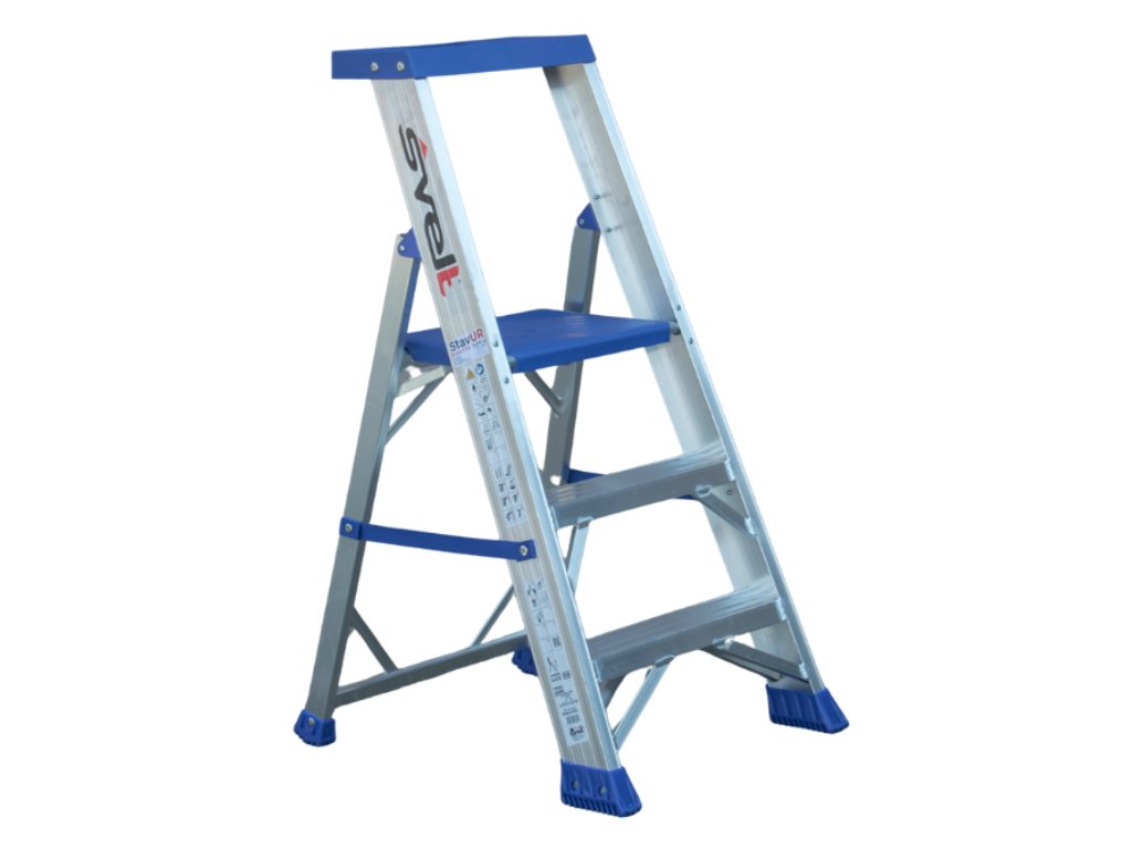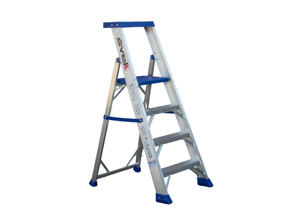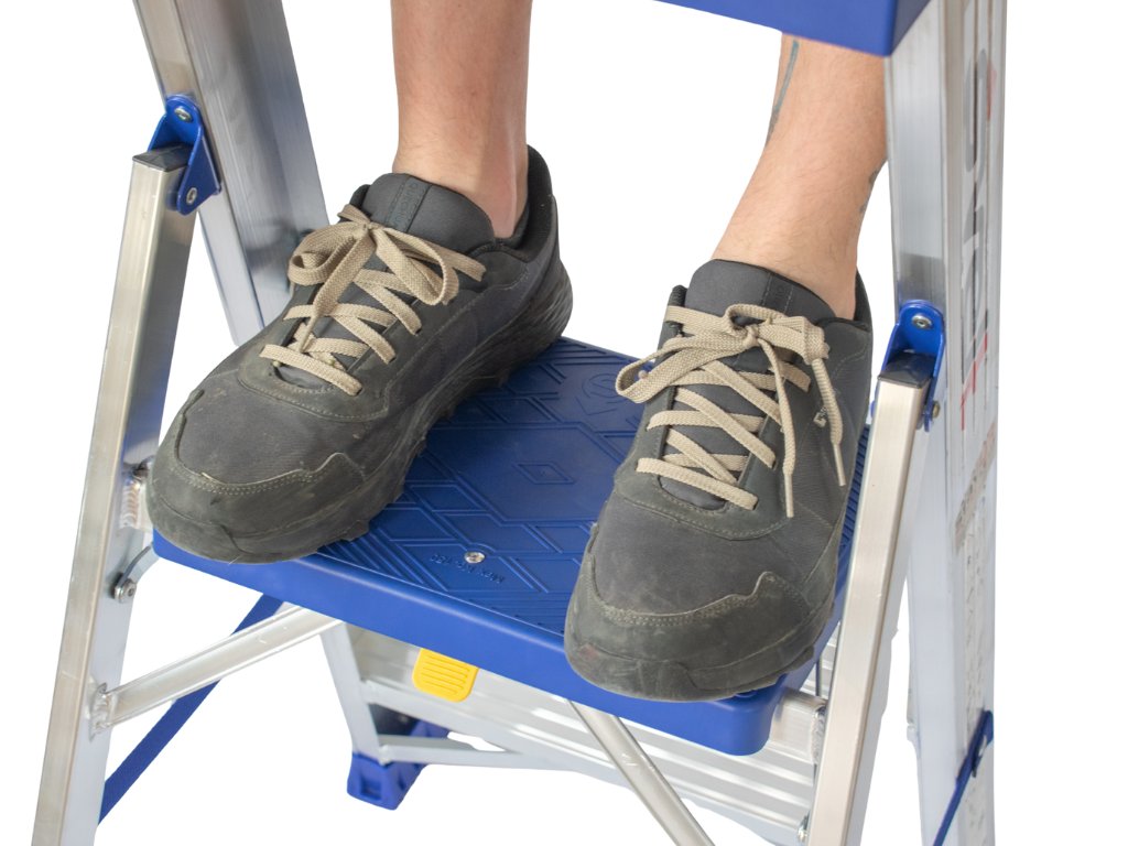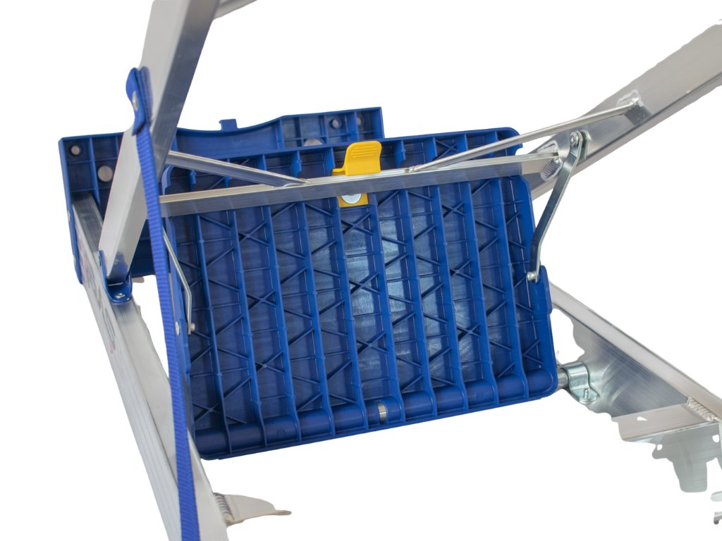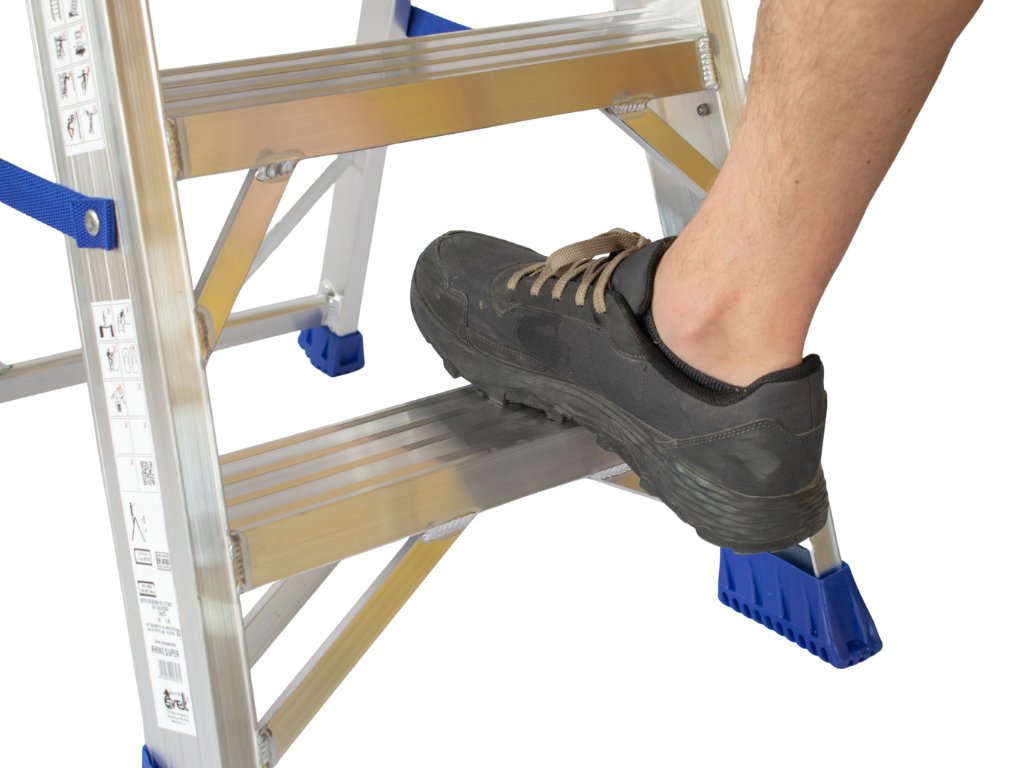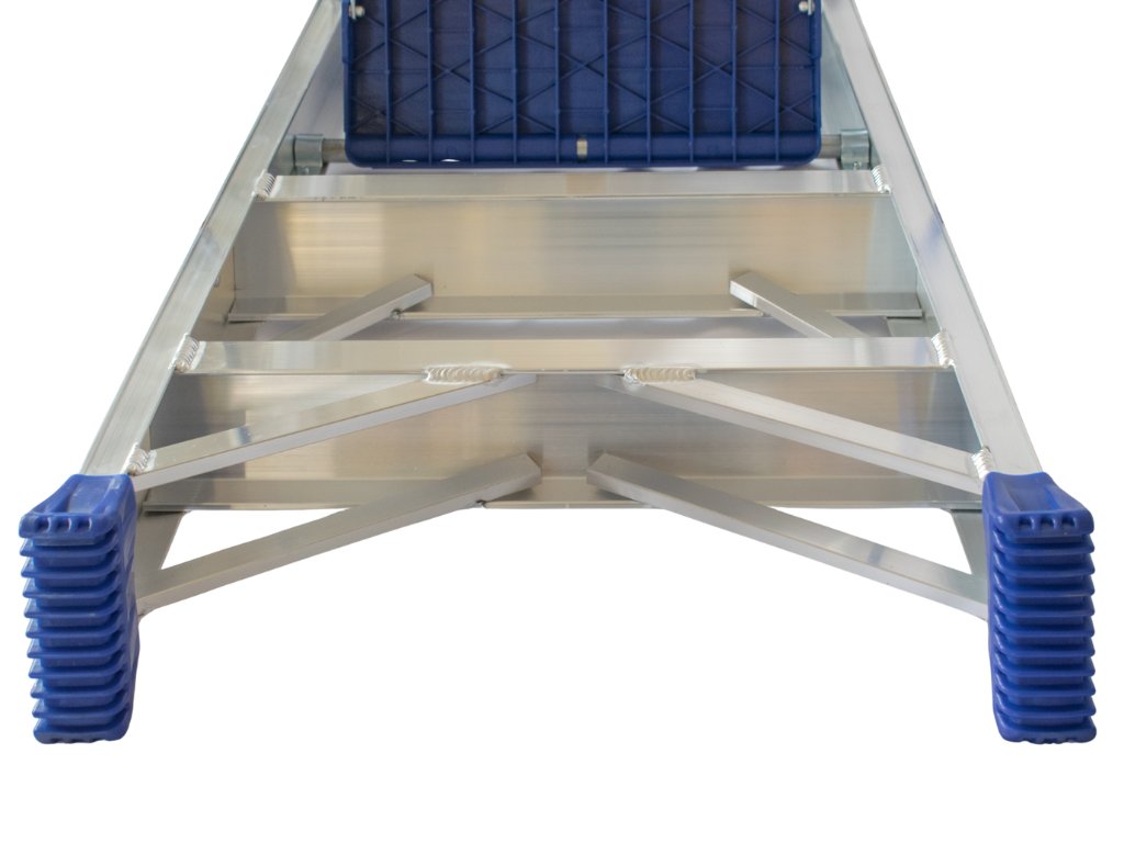 Konstrukcia týchto schodíkov je vyrobená z rebrovaného extrudovaného hliníka so zváranými spojmi podľa normy EN ISO 9606, čo zaisťuje maximálnu pevnosť a dlhú životnosť. Schodíky sú vybavené nadštandardne širokými stupňami, čo poskytuje maximálnu stabilitu. Ďalej ponúkajú veľkú protišmykovú plošinu z vystuženého polypropylénu (25,5 × 35 cm) a ergonomické gumové päty pre bezpečný kontakt s povrchom.