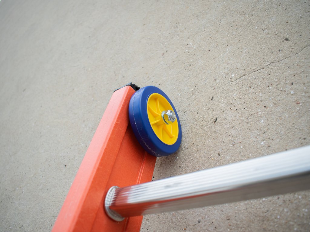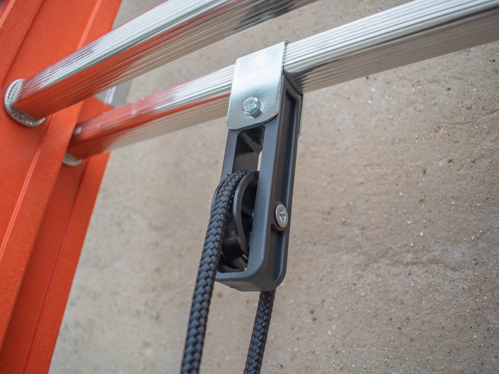 Rebrík je vybavený posuvnými kolieskami s dvojitou funkciou – pri vysúvaní slúžia na pohodlný pohyb po stene a pri prenášaní umožňujú ľahké ťahanie po zemi. Stabilizátor s šírkou 49 cm zabezpečuje pevnú stabilitu počas práce aj manipulácie. Výšku nastavíte jednoducho pomocou lana a kladky. Nosnosť rebríka je 150 kg podľa európskej normy EN 131. Rozostup medzi priečkami je 28 cm, čo uľahčuje pohodlný výstup aj pri dlhšom používaní.
